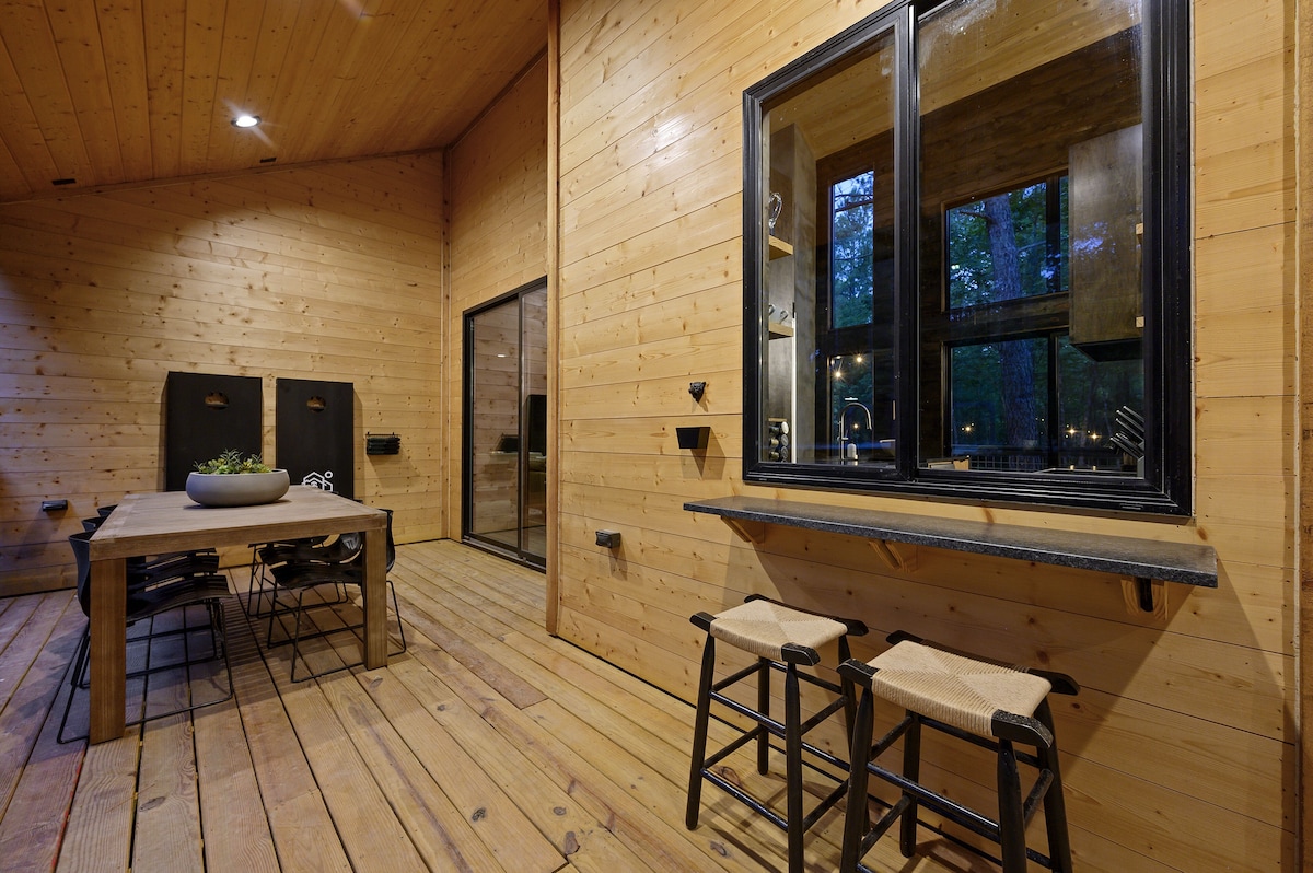 Located less than five minutes from restaurants, wineries and activities in Hochatown, YOLO Cabin is a perfect year-round getaway. Watch your favorite team during fall football season on one of five smart HDTVs, ideally from the hot tub or while lounging next to the gas-burning fireplace. Guest mode on TVs allows you to use your own subscriptions and automatically signs you out upon departure. In the spring and winter months, breathe in fresh mountain air and roast S’mores while gathered around YOLO’s fire pit surrounded by towering pines. Spend your summer days boating at beautiful Broken Bow Lake or kayaking at Beavers Bend State Park, then make the quick drive back to the cabin and recharge with a good book on the hammock. Rain is welcomed at YOLO too, just step onto the patio to listen to the water rushing through the seasonal creek at the front of the cabin or sit in the hot tub and stream your favorite movie. You can even play cornhole under the patio cover or in the back play area surrounded by pines. Whatever outdoor activity you choose, when the drinks need refilling, or snacks need a refresh, use the bar pass-thru window to the kitchen. Please note that gas fireplaces are seasonally available during the cooler months of October-April.
